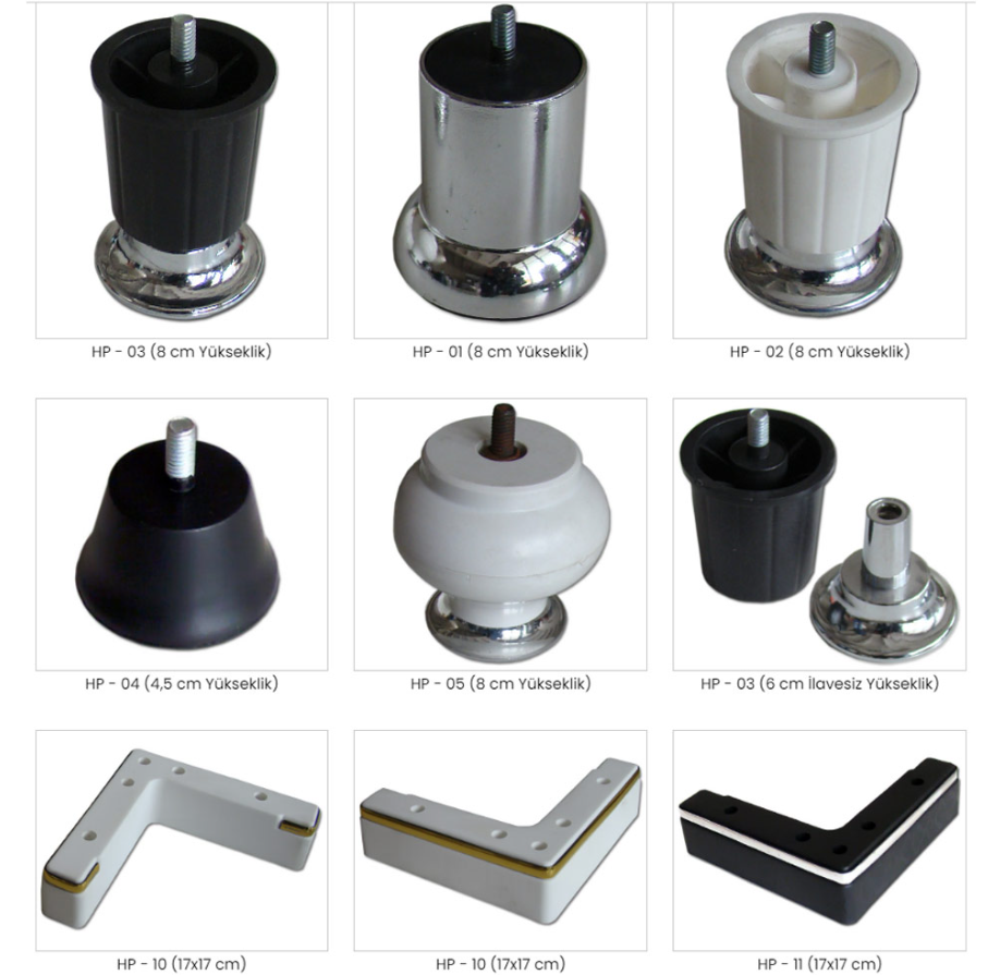 Koltuk ayakları, yumuşak grup mobilyaların iskeletine monte edilen, hem görsel bütünlüğü sağlayan hem de temizlik kolaylığı sunan parçalardır. Dinamik yüklere karşı dirençli yapıdadırlar.